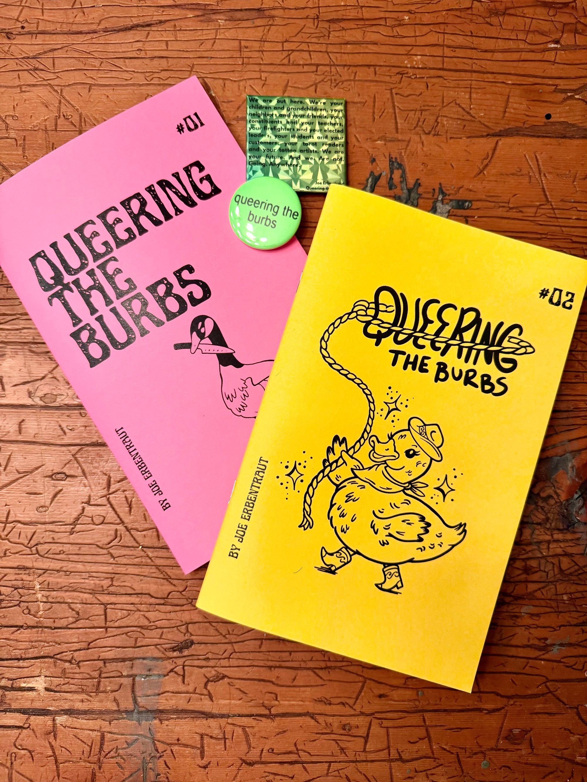 Pick up both editions of the Queering the Burbs zine, plus the Brat Green Queering the Burbs holographic magnet and 1” pin, all at a big (29%!) discount because it’s all bundled together, bb!